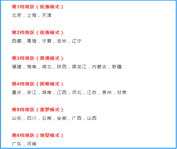 第三檔次被定為“普通模式”,這些地區(qū)的考生經(jīng)歷的高考難度在全國范圍內(nèi)屬于正常水平,沒有優(yōu)惠,但是也沒有過分的競爭壓力。