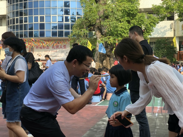 為了弘揚(yáng)中國(guó)傳統(tǒng)文化,給一年級(jí)新同學(xué)一個(gè)有意義的開(kāi)學(xué)典禮,更快的融入小學(xué)的學(xué)習(xí)生活,全體師生召開(kāi)了開(kāi)學(xué)典禮。首先,余壁峰校長(zhǎng)與一年級(jí)班主任老師熱情洋溢地為新生用紅色的朱砂在孩子們的額頭正中點(diǎn)上紅痣。“痣”通“智”,意為開(kāi)啟智慧,以此寄托美好的愿望,從此眼明心亮。啟智引入大門(mén)后,每一個(gè)孩子還獲贈(zèng)了《弟子規(guī)》,并由六年級(jí)的大哥哥大姐姐手拉手踏上紅地毯走進(jìn)會(huì)場(chǎng)。入學(xué)典禮上升國(guó)旗唱國(guó)歌,誦讀《弟子規(guī)》,展現(xiàn)出學(xué)生良好的精神面貌。接著人潮教育羅錦添校長(zhǎng)和孩子們“一撇、一捺、置筆、收墨”在莊重的儀式中寫(xiě)下厚重的“人”字。羅校長(zhǎng)還一邊示范一邊介紹,人字有兩筆構(gòu)成,一撇一捺,我們要團(tuán)結(jié)互助,互相幫助,孝敬長(zhǎng)輩,樂(lè)于學(xué)習(xí),知書(shū)達(dá)理,富有愛(ài)心,知錯(cuò)能改,不斷進(jìn)步,熱愛(ài)祖國(guó),頂天立地,寫(xiě)完要做一個(gè)堂堂正正的人。之后“拜師禮”在大隊(duì)輔導(dǎo)員朱文娟老師對(duì)“恩師”這個(gè)詞語(yǔ)莊重的解讀中,孩子們?nèi)瞎葜x即將陪伴他們的恩師,孩子們?nèi)瞎葜x養(yǎng)育自己的父母。最后,由余校長(zhǎng)代表學(xué)校向全體師生傳達(dá)了新學(xué)期祝福,同時(shí)向同學(xué)們提出新學(xué)期的希望:希望同學(xué)們養(yǎng)成好習(xí)慣,做一個(gè)懂禮貌,講文明,有道德的小學(xué)生。