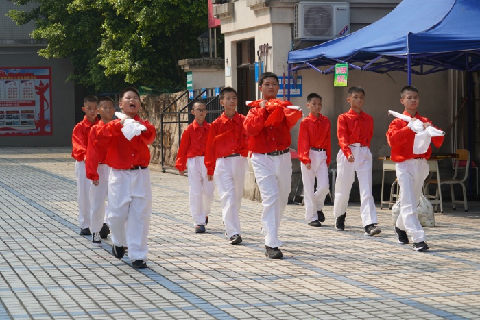 燦陽(yáng)下,全體師生望著國(guó)旗冉冉升起,嚴(yán)肅敬禮,并高唱國(guó)歌,嘹亮的歌聲在美麗的校園久久回蕩。