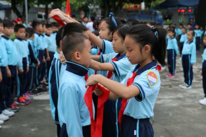 隨著洪亮的《中國少年先鋒隊隊歌》歌聲響起,隊員們佩戴著鮮艷的紅領(lǐng)巾,臉上流露著激動和喜悅。80多名新入隊的同學(xué)佩戴上了鮮艷的紅領(lǐng)巾,他們在大隊輔導(dǎo)員的帶領(lǐng)下,舉起稚嫩的拳頭,莊嚴(yán)宣誓,光榮地成為了一名少先隊員。入隊儀式上,每個少先隊員的臉上都洋溢著自豪和喜悅。對于老隊員們來說,重溫入隊誓詞,使他們的精神再次受到了鼓舞,又一次深刻體會到了作為一名少先隊員肩上的責(zé)任。
