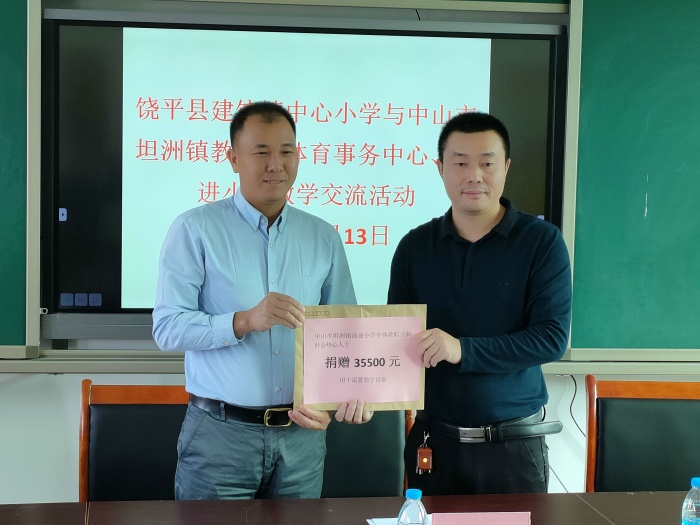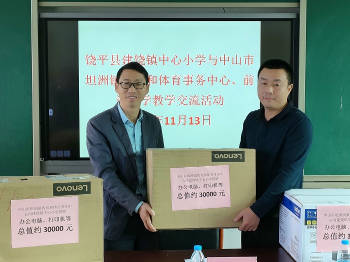 隨后,由張志略主任代表坦洲鎮(zhèn)教育和體育事務(wù)中心、郭炳森校長代表坦洲鎮(zhèn)前進小學教職員工和熱心人士分別向建饒鎮(zhèn)中心小學捐贈教學設(shè)備。 下午,一行走訪了遠離鎮(zhèn)區(qū)的秀溪小學,向秀溪小學的全體學生捐贈了文具,并勉勵同學們好好學習。