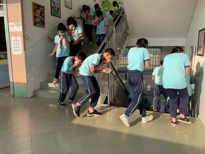 隨著校園內(nèi)響起的警報聲,在班主任的帶領(lǐng)下,全體學(xué)生用濕毛巾、手帕等捂住口鼻有序撤出教學(xué)樓;整個應(yīng)急演練活動規(guī)范、有序、緊湊、高效,按照疏散演練方案設(shè)定的逃生路線,迅速而有序地到達(dá)指定安全位置。