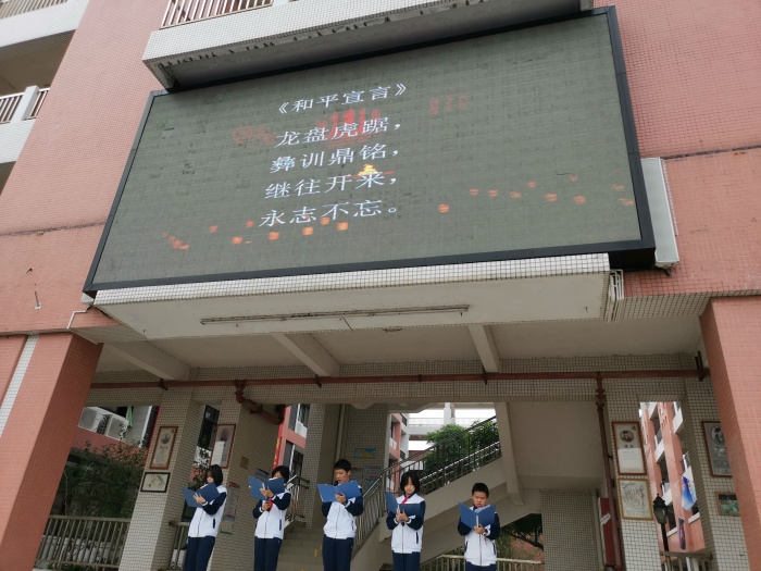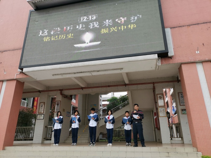 在紀(jì)念活動(dòng)的第二部分,鄒老師介紹了南京大屠殺的概況,并重溫了國(guó)家設(shè)立南京大屠殺公祭日紀(jì)念活動(dòng)的相關(guān)視頻,悲壯的音樂(lè)、肅穆的畫面,讓全體師生仿佛重回到了83年前的南京,看到了河山被踐踏、同胞被屠殺。最后全體師生情悲意堅(jiān),握緊拳頭、抬起頭顱高聲齊誦公祭日的《和平宣言》?;顒?dòng)后,校長(zhǎng)吳劍文勉勵(lì)全體師生要銘記歷史傳承精神、勿忘國(guó)恥振興中華,要教師踐行立德樹人為人師表,要學(xué)生學(xué)好本領(lǐng)報(bào)效祖國(guó)。