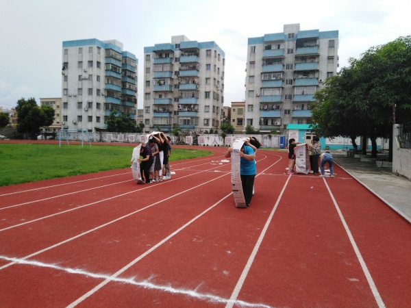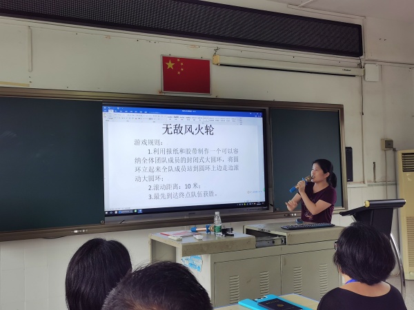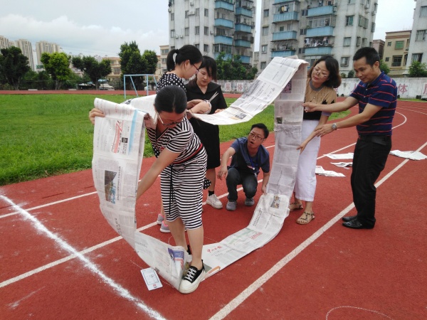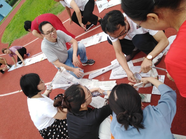 然后全體老師到達運動場開始活動。隨著哨聲響起,各組隊員馬上分工合作:有的指揮、有的折報紙、有的粘膠帶。很快就做出了報紙大圓環(huán)、全組隊員在圓環(huán)里面滾動到達終點。每一個環(huán)節(jié)都牽動著隊員的心弦,同呼吸,共命運,彼此加油、歡呼、鼓勁,讓身心得到放松。