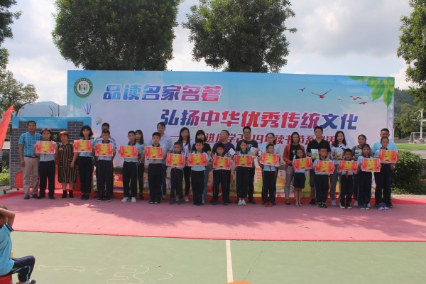 首先是郭炳森校長為活動致辭。郭校長希望全體同學(xué)養(yǎng)成愛讀書的習(xí)慣,掌握讀書的方法,廣泛閱讀,開拓視野,并號召同學(xué)們品讀名家名著,弘揚中華優(yōu)秀傳統(tǒng)文化。接著,三(1)班的嚴(yán)梓華、廖冬同學(xué)繪聲繪色地為我們講述了一個生動的故事《愚公移山》 ,同學(xué)們聽得津津有味。五(1)班的羅曼妮等九個同學(xué)帶來精彩的課本劇表演《晏子使楚》,博得了同學(xué)們的陣陣喝彩。五(3)班的郭穎嵐和鄭欣雅聲情并茂地和大家交流自己讀書的感受,分享讀書的快樂。六(2)班的黃坤等四位同學(xué)為我們推薦了《三國演義》《紅樓夢》等自己讀過的好書,坦言書已經(jīng)成為了自己形影不離的好朋友。在一陣熱烈的掌聲中,表現(xiàn)突出的“書香家庭”代表上臺領(lǐng)獎,由郭炳森校長為他們頒發(fā)榮譽證書。