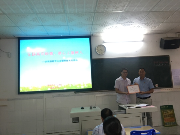2018年9月10日下午5:00,前進(jìn)小學(xué)全體老師集中在多媒體室歡慶教師節(jié)。會(huì)上,郭炳森校長代表學(xué)校向全校老師致以親切的節(jié)日問候并表示衷心的感謝。接著,全體老師觀看央視“面對(duì)面”欄目《李鎮(zhèn)西:教育的幸福》,感受李鎮(zhèn)西老師的教育情懷,做一名一輩子都幸福的教育工作者。然后,郭校長轉(zhuǎn)達(dá)了上級(jí)領(lǐng)導(dǎo)對(duì)全體老師的節(jié)日慰問,勉勵(lì)大家:不忘初心、牢記使命,努力提升教育質(zhì)量,為辦好人民滿意的教育貢獻(xiàn)更大力量。在思想上要嚴(yán)格要求自己,在行動(dòng)上要努力提高自己,不斷提高我們教師自身的道德素養(yǎng),才能培養(yǎng)出社會(huì)需要的、人民滿意的高素質(zhì)人才。最后,對(duì)獲得2017學(xué)年市級(jí)、鎮(zhèn)級(jí)優(yōu)秀老師、優(yōu)秀班主任、師德個(gè)人給予表彰,并號(hào)召全體教師向他們學(xué)習(xí),為學(xué)校的各項(xiàng)工作做出新貢獻(xiàn)。