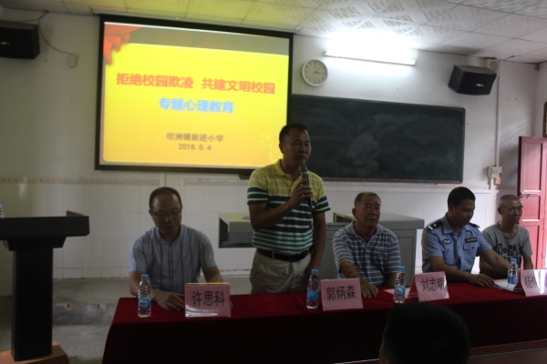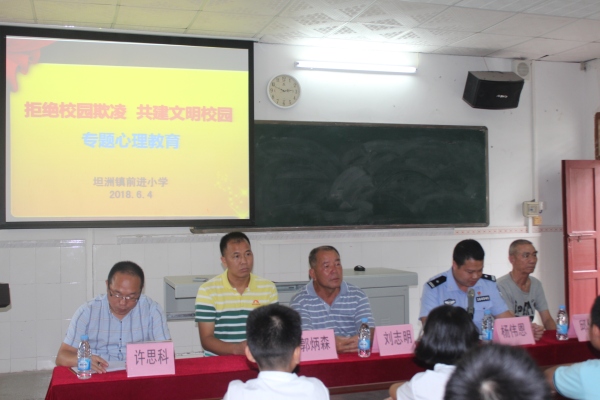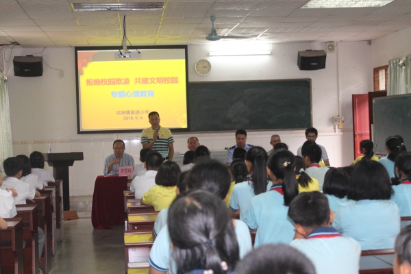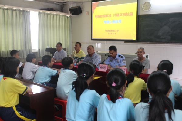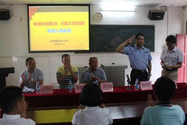 為了進(jìn)一步預(yù)防校園欺事件發(fā)生,增強(qiáng)學(xué)生的法制觀念,提高學(xué)生防范意識和保護(hù)能力,向?qū)W生提供一個(gè)良好的校園學(xué)習(xí)環(huán)境,保障學(xué)生身心健康發(fā)展,6月4日下午,坦洲鎮(zhèn)前進(jìn)小學(xué)邀請了鎮(zhèn)永前派出所楊偉恩警官,新前進(jìn)村關(guān)心下一代委員會劉志明和邱伙友兩位同志,對全校師生進(jìn)行了“拒絕校園欺凌,共建文明校園”專題法制教育講座。