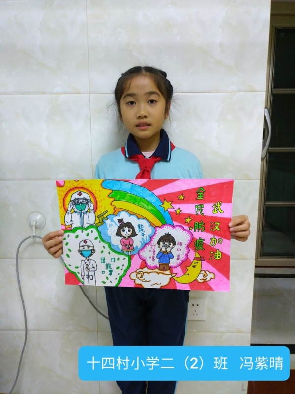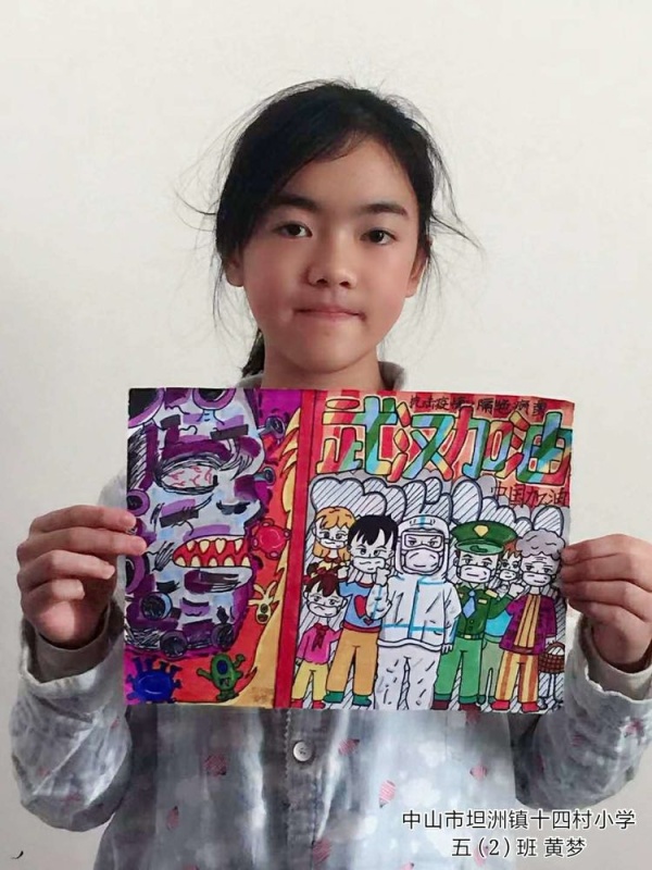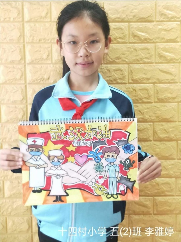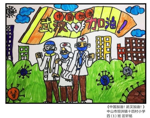 2020年1月22日起,中山市坦洲鎮(zhèn)十四村小學(xué)全體師生在這個(gè)疫情暴發(fā)的特殊時(shí)期,每天按時(shí)做好自己和家人的健康監(jiān)測(cè),同時(shí)心系我親愛的祖國(guó),心系疫區(qū)的同胞們,美術(shù)老師王洪悅在線指導(dǎo)學(xué)生創(chuàng)作繪畫,“中國(guó)加油,武漢加油,抗疫繪畫”創(chuàng)作,雖然時(shí)處寒假,也不能夠阻擋老師學(xué)生家長(zhǎng)的愛國(guó)熱情,雖然有些孩子年級(jí)尚小還有些懵懂,但老師們竭盡所能以這種教育的形式講述給孩子們,引導(dǎo)孩子們向每一個(gè)挺身而出的人致敬,增強(qiáng)他們對(duì)生命意義的再認(rèn)知。2020年2月8日,十四村小學(xué)孩子們呈現(xiàn)了一幅幅栩栩如生并包含濃濃地愛國(guó)情懷的美術(shù)作品。
