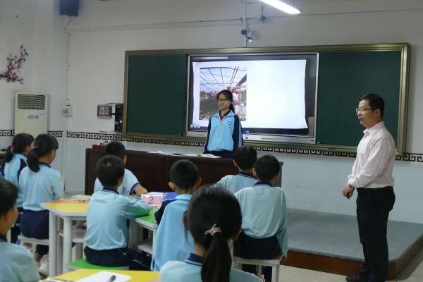 調(diào)研分為三個環(huán)節(jié):座談交流、課例展示、說課議課。在座談交流中,余壁峰校長向參與調(diào)研的老師詳細(xì)地介紹了學(xué)校開展中華優(yōu)秀傳統(tǒng)文化教育教學(xué)的經(jīng)驗與成果,得到了與會老師的充分肯定。隨后,余壁峰校長執(zhí)教了《論語》節(jié)選第十一課。這節(jié)課例設(shè)計得結(jié)構(gòu)完整、思路清晰、內(nèi)容豐富,余校長在引導(dǎo)學(xué)生充分誦讀經(jīng)典的同時,輔以相關(guān)的圖片、音樂和視頻,讓學(xué)生充分感受到了經(jīng)典的魅力與文化內(nèi)涵。課后,先由余校長進(jìn)行簡單的說課,聽課的老師均發(fā)表了自己的看法。林曉潔老師、和王建國老師均認(rèn)為這是一節(jié)“高端大氣上檔次”的傳統(tǒng)文化教學(xué)課例,認(rèn)為余校長的課目標(biāo)定位準(zhǔn)確,觸動內(nèi)心,感人至深。坦洲德育專干張凱老師也說這節(jié)課充分體現(xiàn)了傳統(tǒng)文化教學(xué)課的育人功能。