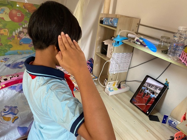 三年級(jí)學(xué)生還沒(méi)復(fù)學(xué),但也在家里參與線上升國(guó)旗儀式