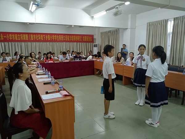 6月25日下午,永一小學(xué)英語科組市級(jí)立項(xiàng)科研課題《數(shù)字化環(huán)境下鄉(xiāng)鎮(zhèn)小學(xué)學(xué)生英語口語能力培養(yǎng)的研究》結(jié)題報(bào)告會(huì)在坦洲鎮(zhèn)永一小學(xué)多媒體室舉行。中山市教研室英語教研員張?zhí)﹦偫蠋煛⒅猩绞杏⒄Z課題結(jié)題工作專家組成員何旭蓉、張麗卿老師、坦洲鎮(zhèn)英語中心教研組組長(zhǎng)盧云老師和坦洲鎮(zhèn)教育指導(dǎo)中心教研專干梁北橋老師出席了報(bào)告會(huì)并對(duì)課題的結(jié)題匯報(bào)工作作出指導(dǎo)。參加本次活動(dòng)的還有坦洲鎮(zhèn)聯(lián)片教研三組的英語教師代表、盧云工作室成員以及永一小學(xué)課題組全體成員。