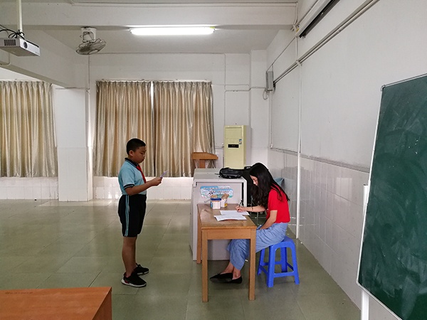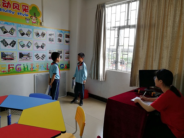 英語(yǔ)口語(yǔ)表達(dá)能力的培養(yǎng),是英語(yǔ)教學(xué)的一個(gè)重要內(nèi)容。坦洲鎮(zhèn)永一小學(xué)的英語(yǔ)老師非常重視對(duì)學(xué)生英語(yǔ)口語(yǔ)能力的培養(yǎng),積極開展《數(shù)字化環(huán)境下鄉(xiāng)鎮(zhèn)小學(xué)學(xué)生英語(yǔ)口語(yǔ)能力培養(yǎng)的研究》這一市級(jí)立項(xiàng)課題的研究。為了全面考核學(xué)生的口語(yǔ)表達(dá)能力,檢測(cè)課題開展的效果,5月15日上午,永一小學(xué)對(duì)參與課題研究的三到五年級(jí)的學(xué)生開展“英語(yǔ)口語(yǔ)能力測(cè)評(píng)活動(dòng)”。