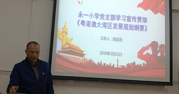 根據(jù)坦洲鎮(zhèn)組織人事辦公室的通知要求,3月25日下午,永一小學黨支部在學校多媒體室開展專題學習會,學習宣傳貫徹《粵港澳大灣區(qū)發(fā)展規(guī)劃綱要》。此次學習會由支部書記陳啟武主講,學校全體黨員和教師一起參加了本次學習會。