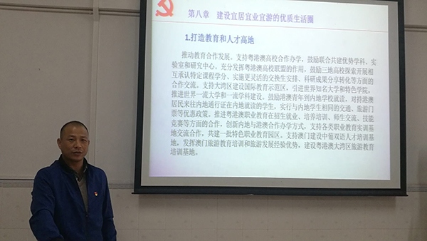 首先,陳書記傳達了坦洲鎮(zhèn)黨委理論學習中心組學習《粵港澳大灣區(qū)發(fā)展規(guī)劃綱要》的情況以及鎮(zhèn)黨委書記鄺偉東同志的宣傳落實要求。接著,陳書記深入到各個章節(jié)詳細講解《規(guī)劃綱要》。從粵港澳大灣區(qū)建設(shè)的規(guī)劃背景、重大意義、總體要求、空間布局,到重要舉措和緊密合作共同參與“一帶一路”建設(shè)等十一個方面,系統(tǒng)地學習了《規(guī)劃綱要》的主要內(nèi)容,讓大家對粵港澳大灣區(qū)建設(shè)有了較為全面的了解。
