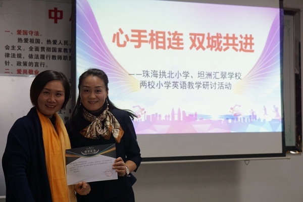 最后,由匯翠學(xué)校陳秀文校長(zhǎng)作總結(jié)發(fā)言。她說,希望每一個(gè)老師都有能做學(xué)科的“有心”人,因?yàn)閼B(tài)度會(huì)讓教學(xué)高效、愉悅。不知不覺中,此次研討活動(dòng)進(jìn)入了尾聲,陳校為翟老師了頒發(fā)榮譽(yù)證書。此次校際交流活動(dòng),為英語課堂的高效奠定基礎(chǔ),校際的交流與合作,有利促進(jìn)兩校教師的專業(yè)成長(zhǎng),也增進(jìn)了兩校之間的友誼。