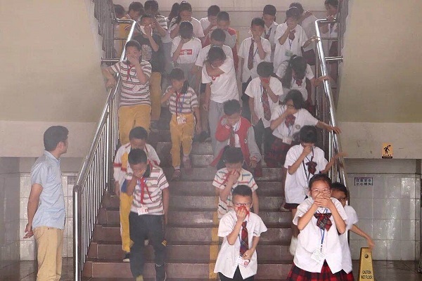 上午9:05,校園內火警警鈴聲響起,演練正式開始。各班主任及樓層負責人按照演練方案指揮學生進行撤離。各班學生在班主任的帶領下,用手帕、紙巾或手捂著鼻子,俯身前進,迅速撤離到學校運動場。全體師生在整個疏散過程中做到井然有序、行動快速,配合默契。整個演練過程用時2分25秒,全校師生2300多人安全撤離安全區(qū)域。何偉華校長就本次疏散演練進行了總結,他強調了緊急逃生演練的重要意義,并對全體師生在演練中緊張迅速、安全有序的表現(xiàn)給予了充分的肯定,他要求全校師生今后要時刻“增強安全意識,珍惜自己的生命”。隨后,政安防火宣傳中心的李教官給全體師生進行了消防知識的培訓。