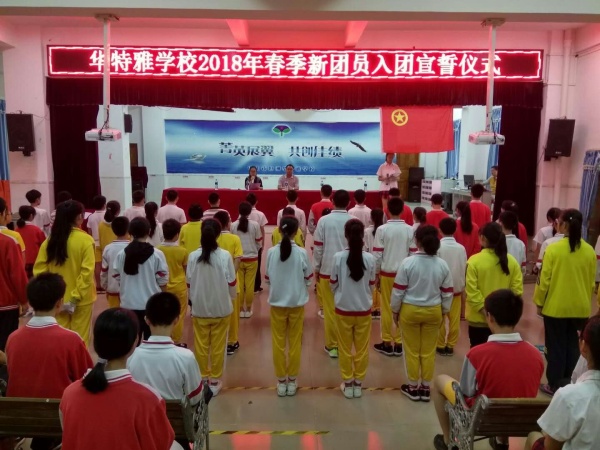 2018年5月4日中午,華特雅學校2018年春季新團員入團宣誓儀式在學校報告廳舉行。學校副校長何偉華、初中部德育主任鄧財秀、初中部教務(wù)處主任段銀燈和團委書記駱貞義參加了本次會議。