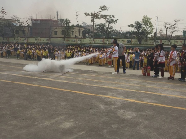 演練的第二部分為珠海市消防安全員李警官進行的消防知識培訓。李警官從最簡單的消防火警電話到發(fā)現(xiàn)火情的處理辦法、消防器材的選擇、使用等方面對師生們進行了培訓,師生們的學習熱情非常高漲,尤其是最后的實踐環(huán)節(jié),上至學校女教師,下至低年級的學生、膽子比較小的女生都踴躍上臺進行嘗試,隊伍排成了一條長龍。師生們也通過實踐,掌握了滅火器的正確使用方法。