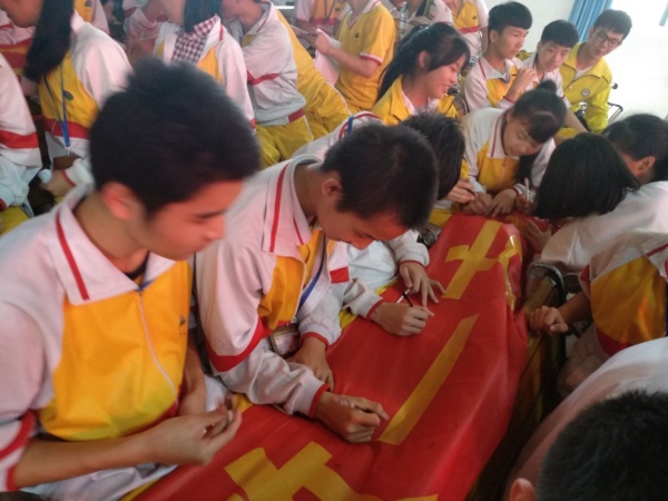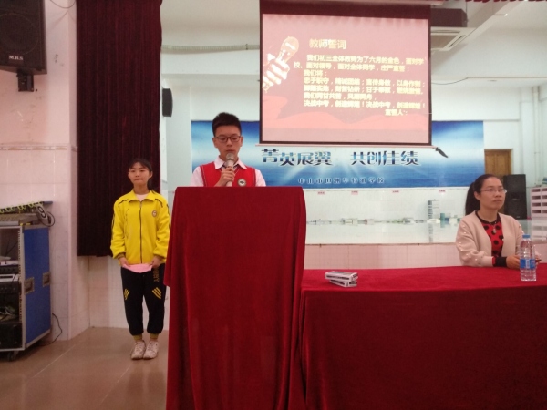 教師代表郭英、學(xué)生代李嘉豪也相繼發(fā)言,發(fā)言中不難看出,初三全體師生都必將在2018中考備考過程中全力以赴、奮勇拼搏。過程中初三全體老師及同學(xué)們還進(jìn)行了莊嚴(yán)的宣誓,展現(xiàn)了他們面對(duì)2018中考勇往直前、舍我其誰的堅(jiān)定信念。