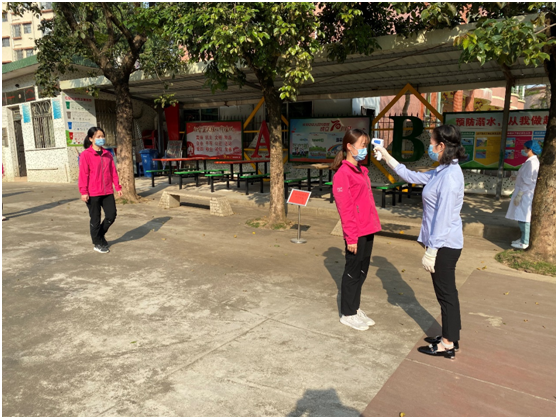 入校晨檢,安全有序。進校測溫是學校日常防控疫情工作第一站,本次演練就學校校門開放、校外馬路的實際情況部署教職工把好這一道安全門檻。為確保學校入校前不發(fā)生擁堵、扎堆、聚集等情況,校門口由安保人員和一位值班教師組織學生排好序列隊伍,每生之間間隔1.5米的安全距離,一個值日教師進行體溫檢測,當檢測學生體溫出現(xiàn)異常時,在無接觸情況下,馬上將學生安全帶至臨時隔離室,由校醫(yī)詢問具體情況,并將情況通知班主任及主管行政進行逐層上報,通知家長接回學生到醫(yī)院就診。
