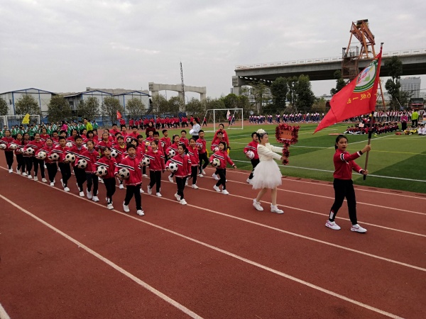早上8:00,運動會入場式在《運動員進行曲》中拉開了序幕。走在最前面的是學校彩旗隊,由各班挑先的成員組成。高遠的藍天,紅的跑道,綠的草坪,鮮艷的彩旗,在金色的陽光下,構(gòu)成了一幅絕美的畫卷。看,四1班的孩子們走過來了,他們身著特色班服,邁著整齊的步伐,喊著響亮的口號,手持足球,精神抖擻地走過主席臺。六1班的大哥哥大姐姐們也走過來了,他們的口號與眾不同“發(fā)型高貴,氣質(zhì)到位,全場吶喊,六1萬歲!”全場忍俊不禁。