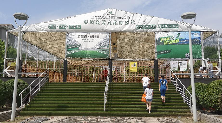 在威騰草坪所在的無錫國家工業(yè)設計園創(chuàng)意園園區(qū)內(nèi),一座可拆卸式的籠式足球場在樹木掩映中悄然矗立,四面圍網(wǎng)+封閉式頂棚使它顯得不那么高調(diào),籠式足球場內(nèi)外蔥翠的人工草坪與周圍的自然植物渾然一體,幾可亂真。