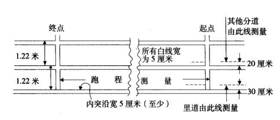 2、直道卜的分道跑起跑線,接力區(qū)線以及跨欄架的欄板前沿應與分道線垂直,如果在彎道上,它們的延長線則必須通過彎道的圓心。不分塑膠道跑的起跑線則應回成弧線。