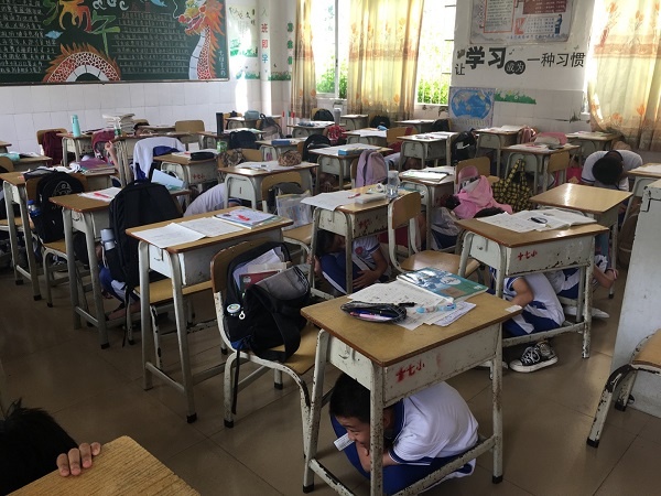 為了此次活動(dòng)能順利進(jìn)行,在演練開始前,學(xué)校進(jìn)行了精心的部署,制定了詳細(xì)的演練方案,明確了通訊聯(lián)絡(luò)員、疏散指揮員、醫(yī)護(hù)人員等相關(guān)成員的責(zé)任。上午八點(diǎn)十分,第一次警報(bào)聲響起,各班學(xué)生在上課教師的指揮下,迅速抱頭或頭頂書包就近蹲在課桌下躲避。警報(bào)聲再次響起后,同學(xué)們?cè)谏险n老師的帶領(lǐng)下,頭頂書本緊張而有序地撤離教室,跑到空曠的運(yùn)動(dòng)場(chǎng)。全體學(xué)生到達(dá)安全地帶后,各班班主任和負(fù)責(zé)疏散指揮的老師迅速就位,維持好各班秩序,清點(diǎn)人數(shù),并向總指揮匯報(bào)班級(jí)情況。整個(gè)演練活動(dòng)用時(shí)9分50秒,達(dá)到了此次防震減災(zāi)應(yīng)急安全疏散演練活動(dòng)的預(yù)期效果。