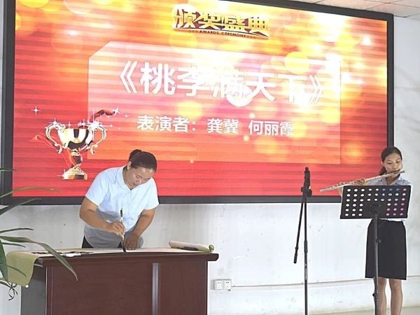 隨著一曲《掌聲響起來(lái)》,把大家?guī)У搅俗钭屓藵M心期待,動(dòng)人心弦的頒獎(jiǎng)環(huán)節(jié)。桂南學(xué)校對(duì)1名市級(jí)師德標(biāo)兵、2名市級(jí)優(yōu)秀教師、1名區(qū)級(jí)優(yōu)秀教育工作者、7名校級(jí)優(yōu)秀班主任、40名校級(jí)優(yōu)秀教師、7名校級(jí)優(yōu)秀員工進(jìn)行逐一表彰,并頒發(fā)了證書(shū)和獎(jiǎng)金;還對(duì)今年中考工作中做出貢獻(xiàn)的16名教師頒發(fā)豐厚的獎(jiǎng)金,希望通過(guò)表彰的方式,讓廣大教師能夠恪盡職守、刻苦專研,努力成為新時(shí)代合格教師。同時(shí)還對(duì)在桂南學(xué)校工作滿五年、十年、十五年的教師頒發(fā)紀(jì)念杯和純金紀(jì)念幣,讓所有老師都能感受到家的溫暖,在今后的生活和工作中更加有歸屬感和幸福感。晚會(huì)還穿插了現(xiàn)場(chǎng)書(shū)法、長(zhǎng)笛演奏、詩(shī)歌朗誦等豐富多彩的文藝節(jié)目,給整個(gè)晚會(huì)增添了不一樣的色彩,整個(gè)現(xiàn)場(chǎng)氣氛融洽,高潮迭起,笑聲不斷。