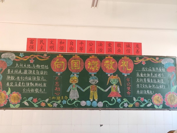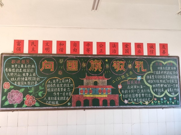 大隊部還組織了一次“向國旗敬禮”為主題的黑板報評比活動。為了出好本次黑板報,各班同學(xué)們團(tuán)結(jié)協(xié)作,懷著對祖國的熱愛,同學(xué)們充分發(fā)揮自己的聰明才智,設(shè)計出一幅幅畫面精美、布局合理、字體端正、內(nèi)容詳實、主題突出的黑板報。在這次活動中,增強(qiáng)了同學(xué)們的愛國主義情懷。