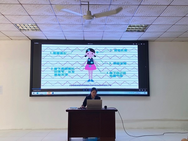 活動的開篇,張主任播放了一個有關(guān)做自信女孩的短片,借此告訴女生們要敢于表現(xiàn)自己,對自己要充滿自信。隨后張主任從“花季青春期”的種種表現(xiàn)入手,激發(fā)學(xué)生的求知欲,進(jìn)而切入到“青春期女生的身體會發(fā)生哪些變化”的相關(guān)知識。在學(xué)生對青春期生理的變化有了一定的了解后,張主任又給學(xué)生講解如何護理、如何選用衛(wèi)生巾等一些月經(jīng)期護理的必要常識。通過一系列青春期知識的講授,女生們對青春期有了更深入的了解,對青春期所發(fā)生的種種變化不再迷茫,并且學(xué)會自我保護。