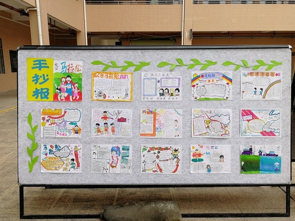活動(dòng)當(dāng)天,學(xué)校還同步舉辦了馬拉松文化系列展。同學(xué)們用書法、思維導(dǎo)圖和手抄報(bào)等形式表達(dá)對馬拉松的熱愛與向往。校道兩旁邊的“跑馬”宣傳欄與馬拉松文化展?fàn)I造了濃郁的“跑馬”氛圍。