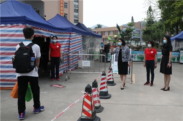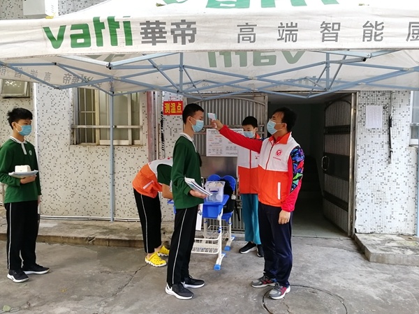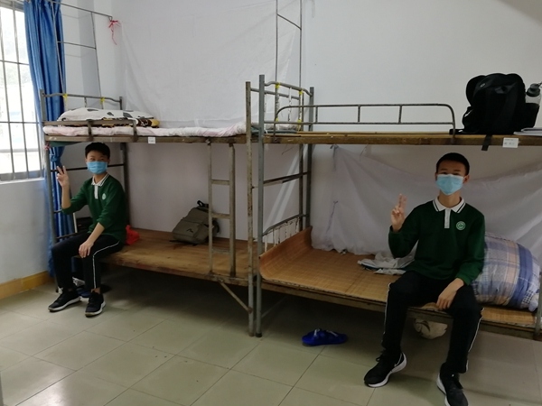 下午1點30分,離通知返校的時間還有半個小時,五桂山學校黨支部書記陳玉玲和藍青林、劉繼恭兩位副校長早早來到學校大門和學校體育館北門,再次檢查設施設備和工作人員的到崗的情況。1:45分開始,懷著急切心情的學子們就迫不及待來到學校大門。在現(xiàn)場老師的引導下,學生順利通過體溫監(jiān)測點,滿懷微笑進入久別重逢的校園。天氣雖然炎熱,但為讓學生有回家的感覺,老師們不辭勞苦,在熾熱的陽光下鼓掌歡迎學生平安返校,引導學生測溫,幫助學生拎生活、學習用品,現(xiàn)場為家長答疑,秩序井然。