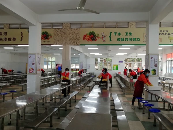 全體后勤人員行動起來。學(xué)校后勤人員清洗飲水設(shè)施設(shè)備,檢查維修水電設(shè)施設(shè)備,想方設(shè)法準備開學(xué)的各項防疫物資儲備,宿舍的清潔、消毒,宿生的床位安排,洗手盆的增加,事無巨細,周密安排。全體外包服務(wù)公司也行動起來。校園環(huán)境的美化、清潔與消毒,飯?zhí)玫那鍧?、消毒,座位的安排,標識的優(yōu)化。所有一切都是為了讓師生回校后有一個明確的指引,確保師生的健康與安全。