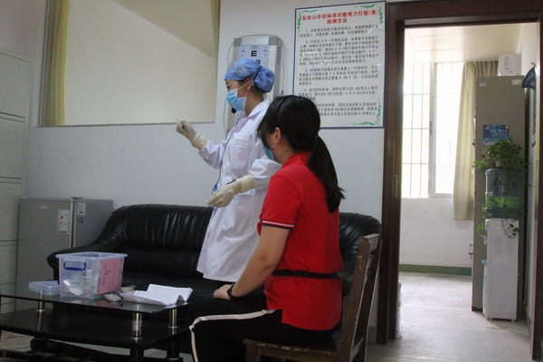 是日下午3:30分,演練開始。第一個(gè)預(yù)設(shè)場(chǎng)景是健康檢查演練。模擬學(xué)校開學(xué)后,在校門體溫監(jiān)測(cè)點(diǎn)發(fā)現(xiàn)某學(xué)生體溫異常。值班行政經(jīng)過再次體溫檢測(cè)確認(rèn)體溫異常,按要求詢問該學(xué)生,確定學(xué)生有與境外疫情重點(diǎn)地區(qū)人員接觸史時(shí),立刻引導(dǎo)學(xué)生進(jìn)入臨時(shí)隔離室并聯(lián)系校醫(yī)室、班主任。學(xué)校醫(yī)務(wù)人員到場(chǎng)后,再次詢問學(xué)生的“三史”,并用水銀體溫計(jì)對(duì)學(xué)生測(cè)量體溫。再次確定學(xué)生體溫異常后,醫(yī)務(wù)人員立即撥打120通知相關(guān)醫(yī)院派車接診并上報(bào)屬地疾控中心。與此同時(shí),醫(yī)務(wù)人員把情況匯報(bào)給學(xué)校負(fù)責(zé)人,并上報(bào)區(qū)教指中心。專業(yè)消毒人員最后對(duì)相關(guān)區(qū)域進(jìn)行消毒。