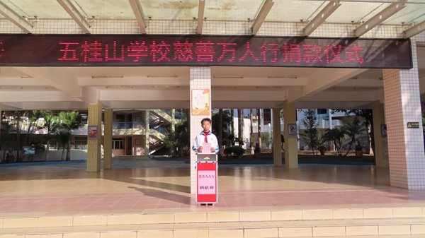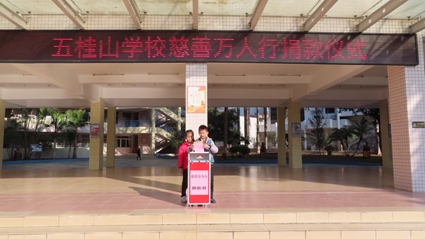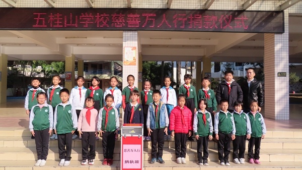 2019年12月20日,五桂山學校舉行“慈善萬人行”的捐款儀式。本屆慈善萬人行活動,五桂山學校全體師生共籌得善款32540元,比去年多籌善款5700多元。其中:一年級、四年級、五年級、六年級、七年級等5個年級表現(xiàn)突出,各班都籌得500元以上的善款,其中六(3)班籌得1000元,四(2)班更是籌得善款1339.5元。正所謂:有志不在年高,為善不分貴賤。人人向善,為善最樂,弘揚博愛精神,共建美好家園,五桂山學校全體師生永遠在路上。