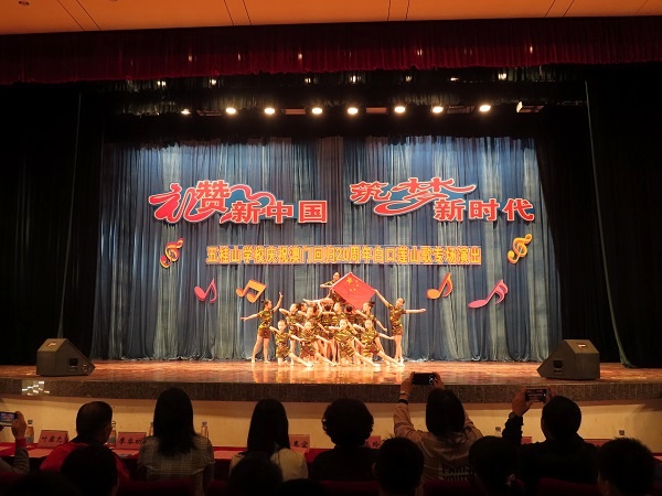 在中華人民共和國成立70周年之際,我們迎來了澳門回歸二十周年的偉大日子。為了營造濃厚的校園愛國情懷和客家文化氛圍,進(jìn)一步豐富校園客家文化、加強(qiáng)校內(nèi)外客家文化的交流、更好地傳承并發(fā)展客家文化。五桂山學(xué)校在文化中心舉辦了以“禮贊新中國 筑夢(mèng)新時(shí)代”為主題的慶祝澳門回歸20周年白口蓮山歌專場(chǎng)演出。出席觀看演出的嘉賓有:五桂山團(tuán)工委書記陳惠宜、五桂山婦聯(lián)專職副主席謝惠清、五桂山教育事務(wù)指導(dǎo)中心吉婷老師及各村主管教育的領(lǐng)導(dǎo)等。五桂山學(xué)校陳玉玲副校長等行政及4至6年級(jí)的師生觀看了演出。