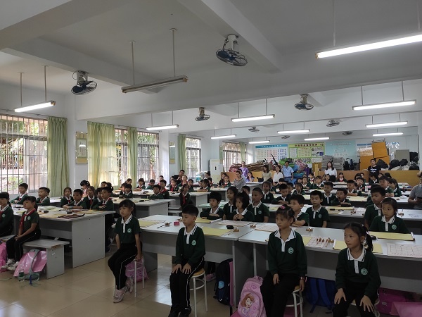 3:30—5:30是黃老師為80名一、二年級小學生的授課時間。黃老師首先給同學們播放了一段視頻,視頻中的小學生給同學們示范了書法課的課堂常規(guī)以及執(zhí)筆、倒墨、沾墨、刮筆、整理工具的方法。接下來黃老師教同學們學習隸書的橫畫和豎畫,黃老師做示范,學生跟著學,80人的課堂井然有序。
