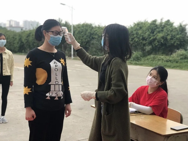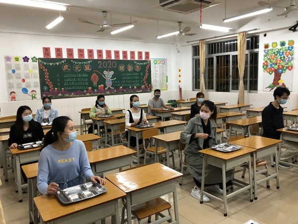 第二階段是模擬演練。老師們分工合作,扮演學生進入演習狀態(tài),入校體溫測試、鞋底消毒、校門口值日老師引導、隔離觀察流程、緊急情況處理等各個環(huán)節(jié)落實到人,確保演練細節(jié)到位。從學生乘坐校車、入校離校路線、口罩核查、紅外體溫檢測、衛(wèi)生消毒、間隔就餐等多方面考慮,為及時發(fā)現(xiàn)并妥善處理學生返校時可能出現(xiàn)的突發(fā)情況積累第一手的應變經(jīng)驗。