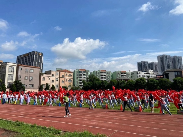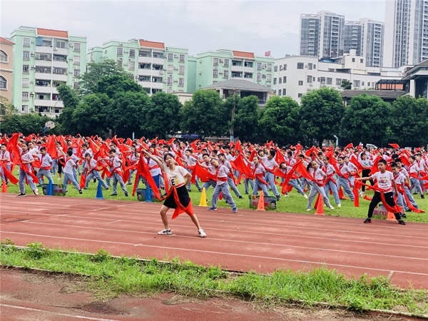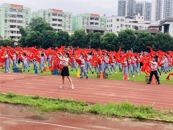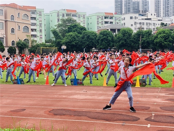 為了讓學生們進一步地了解感受水滸人物的獨特魅力,增強自身身體素質(zhì),北區(qū)小學經(jīng)過研究討論,用《好漢歌》編排了一套活力滿滿,動感十足的校本操,搭配著節(jié)奏感非常強烈的歌曲,學生跳起來動感、精神。在動感、豪爽的步子中舞起腰間的紅綢帶,顫步晃頭,扭腰抖肩。整體動作爽朗風趣、活潑大方。搭配上熱情豪邁的《好漢歌》,既能感受到水滸英雄的疏朗豪情,又能很好地鍛煉身體,每日大課間鈴聲響起時,他們便會迫不及待地拿出屬于自己的紅綢帶,迅速地排好隊集中在操場上,跟隨著彭靜老師的口令學習集體舞動作。驕陽如火,孩子們手中的紅綢舞動起來,連成一片紅色的海洋。