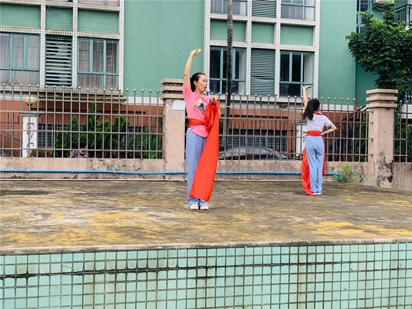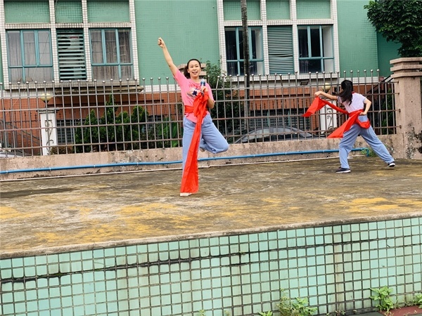 每個孩子的臉上都洋溢著燦爛的笑容,高年級的小朋友們學得快一些,動作有模有樣,踩著鼓點變化著腳步,揚起紅綢;低年級的弟弟妹妹們學得稍微慢一些,但跟著哥哥姐姐們搖擺著小手,跺著小腳,也是活力四射,精神滿滿。通過動感的音樂、豪邁的舞蹈動作,在舞蹈的過程中學生的全身心都沉浸在英雄好漢的豪邁情懷中,心中那份因疫情而沉寂的心情一下子被趕到九霄云外,因疫情而產(chǎn)生的小情緒都被動感的節(jié)奏所感染,孩子們個個都笑起來、跳起來、舞起來!