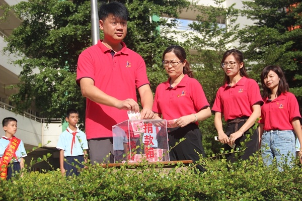 在大隊(duì)輔導(dǎo)員殷老師的宣布下,九洲基小學(xué)2020年扶貧濟(jì)困日“師生獻(xiàn)愛(ài)心”暨主題黨日活動(dòng)正式開(kāi)始,首先由九洲基小學(xué)黨支部書(shū)記艾斌同志帶領(lǐng)全體教師上臺(tái)捐款。老師們紛紛慷慨解囊,奉獻(xiàn)自己的一片愛(ài)心。一份份心意,一顆顆牽掛的心,在無(wú)數(shù)雙愛(ài)心之手中傳遞濃濃的溫暖。