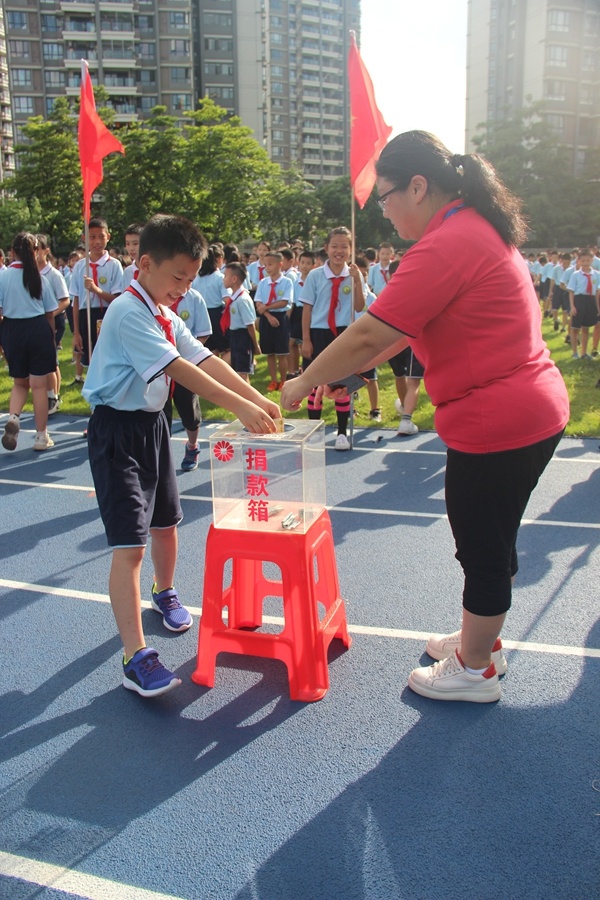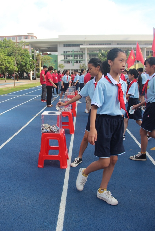 隨后,學(xué)生以班級(jí)為單位,本著自愿的原則,各班同學(xué)一個(gè)個(gè)輪流上前,把自己的零花錢(qián)拿出來(lái),鄭重地放入捐款箱。各班同學(xué)踴躍參與,你一元,我一元,匯聚百分愛(ài)心,點(diǎn)亮一片星空。用自己的實(shí)際行動(dòng)傳遞關(guān)愛(ài),為需要幫助的困難人群送上一份自己的心意。