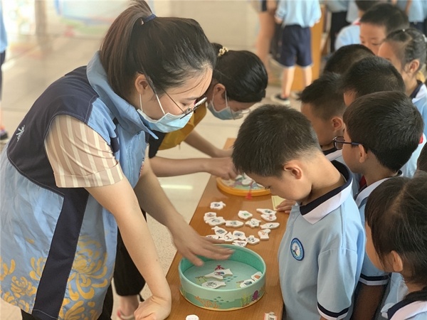 午睡初醒,熱心的社區(qū)志愿者早已在大堂里布置好一切,等待著孩子們的到來。一至三年級學(xué)生分批由班主任帶隊到學(xué)校一樓大堂參加活動,孩子們像放飛的小鳥,興致勃勃地期待本次活動。本次活動共有六個攤位游戲,分別是“垃圾當(dāng)入樽”、“垃圾分類知識問答”、“氣候拼圖”、“節(jié)水俄羅斯方塊”、“垃圾分類飛鏢”等益智活動,通過寓教于樂的方式,學(xué)生了解和學(xué)習(xí)到了垃圾分類的知識。每個攤點的小游戲與垃圾分類知識緊密聯(lián)系,學(xué)生在參與游戲的同時學(xué)習(xí)垃圾分類相關(guān)知識。