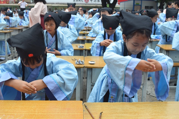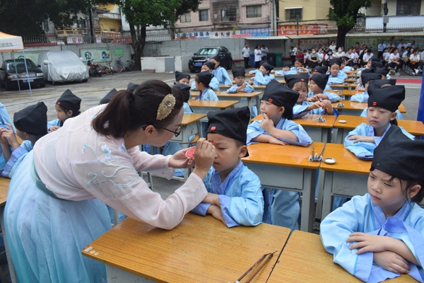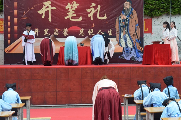 本次“開筆禮”儀式包括:正衣冠、禮拜先師、敬謝父母、敬拜師長、朱砂啟智、書字明理、擊鼓鳴志、經(jīng)典立志等多個(gè)環(huán)節(jié)。
