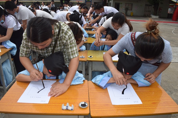 “一撇一捺學(xué)做人”,“書字明理”環(huán)節(jié);家長們握著孩子的手,拿起筆墨,在紙上共同寫下意義深遠(yuǎn)的“人”字。“人”音同“仁”,孔子認(rèn)為,“人”就是“仁”,仁:仁義、仁者、愛人。孝親尊師是做人的基本,希望同學(xué)們做個(gè)有德行的人,有理想的人,有文化的人。腳踏實(shí)地,做一個(gè)堂堂正正的中國人。