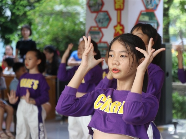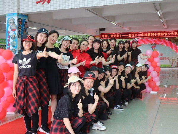請(qǐng)您來(lái)聽(tīng)!由張雪老師、蘇彩燕老師、陳嘉榆老師帶來(lái)的快板三句半,原來(lái)還有一個(gè)驚喜——鄭鎰?wù)绽蠋煹氖⑶榧用?,為?jié)日增色不少,一不留神,成主角了,成功圈粉!他們實(shí)話實(shí)說(shuō)地把北小的老師們都夸了一遍——開(kāi)拓創(chuàng)新的劉云霄校長(zhǎng)、心系師生的曾春紅校長(zhǎng)、廢寢忘食的葉茂發(fā)主任、管班有序的廖少中老師、關(guān)愛(ài)學(xué)生的林欣旭老師、掛心學(xué)生的吳明娟老師、不畏艱難的Miss湛,個(gè)個(gè)都是耀眼的明星,北小的講壇,星光熠熠!請(qǐng)您來(lái)看!一群嘻哈姑娘,又酷又颯地出現(xiàn)在舞臺(tái)上,你能想象這是平時(shí)站穩(wěn)三尺講臺(tái)的老師嗎?沒(méi)錯(cuò),就是這一群姑娘,站得穩(wěn)講臺(tái),跳得了熱舞。