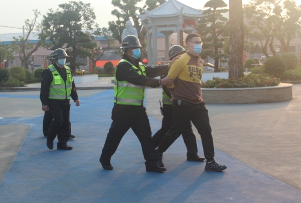 同時應(yīng)急防暴組的老師聯(lián)合門衛(wèi)迅速出動,持鋼叉、防暴盾、棍棒等防暴工具,與“暴徒”對峙周旋,讓他無法靠近師生,保證了全體師生的安全,隨后公安特警趕來將“暴徒”制服。至此,警報解除。