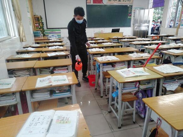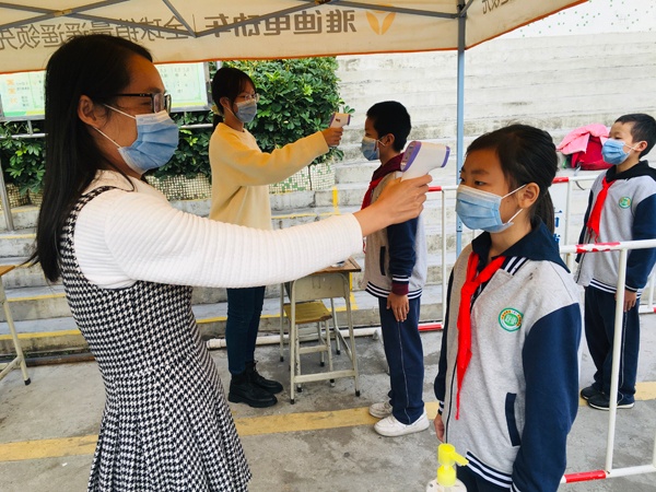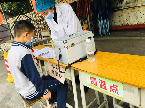 演練中,學(xué)生按標(biāo)準(zhǔn)佩戴好口罩,從校門(mén)外緩沖區(qū)排隊(duì),按照警戒線標(biāo)志排兩隊(duì),間隔一米,分兩個(gè)縱隊(duì)依次進(jìn)入檢測(cè)通道,檢測(cè)人員對(duì)學(xué)生進(jìn)行體溫檢測(cè),體溫正常的學(xué)生按照學(xué)校防控要求安靜有序進(jìn)入校園。在過(guò)程中,值班教師發(fā)現(xiàn)體溫異常學(xué)生后,將其帶到臨時(shí)隔離點(diǎn)。與此同時(shí),學(xué)生通道暫停使用,消毒人員對(duì)學(xué)生通道進(jìn)行噴霧消毒。再次確定學(xué)生體溫異常后,學(xué)校校醫(yī)、防控主管領(lǐng)導(dǎo)、班主任等相關(guān)人員按照上報(bào)處置流程進(jìn)行處理。