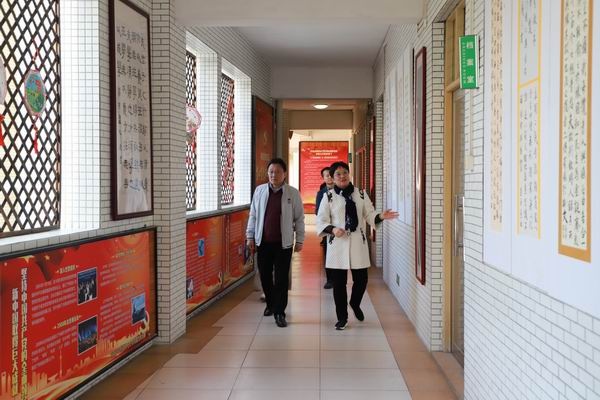 在霍熔坪書(shū)記的帶領(lǐng)下,廖誠(chéng)書(shū)記分別參觀了一樓的詩(shī)禮展廳和始興書(shū)院。隨后重點(diǎn)參觀了剛剛揭幕的學(xué)校黨建文化長(zhǎng)廊、教師文化長(zhǎng)廊和藝術(shù)長(zhǎng)廊。從小導(dǎo)游和霍熔坪書(shū)記的介紹中,大家了解到學(xué)校秉承“依托黨建、立德樹(shù)人”的辦學(xué)理念。在學(xué)校114周年校慶之際,全新打造了“三廊一廳”,這正是學(xué)校重視長(zhǎng)遠(yuǎn)發(fā)展、教師專(zhuān)業(yè)成長(zhǎng)以及學(xué)生全面發(fā)展的最好體現(xiàn)。廖誠(chéng)書(shū)記一邊琢磨著黨建文化長(zhǎng)廊上的內(nèi)容,一邊贊賞其展示形式頗具創(chuàng)新性;一邊饒有趣味地欣賞著師生的書(shū)法、繪畫(huà)、篆刻、手工制作等作品,一邊不斷肯定學(xué)校近年來(lái)在藝術(shù)教育上所做出的成績(jī)。就用他的一句話概括曰:“ 紅色文化有特色,藝術(shù)文化很突出。 ”